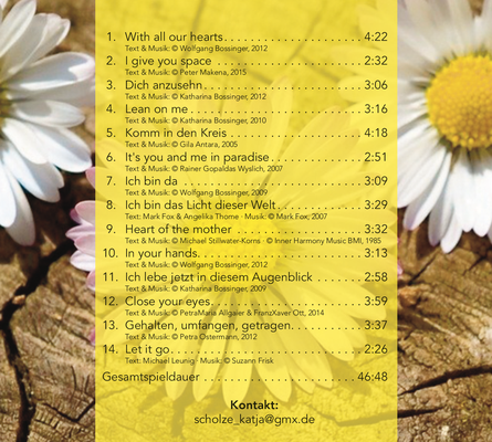 Es ist mir ein großes Bedürfnis, mich mit meiner Stimme auszudrücken und mit ihr etwas Heilsames in die Welt zu bringen. So sind diese CDs mit Mantras und heilsamen Liedern entstanden. Lassen Sie sich berühren.